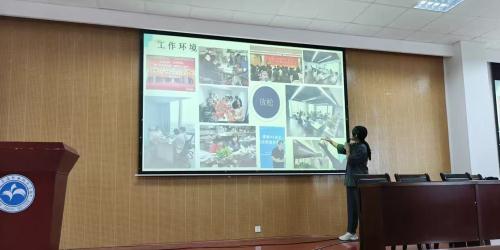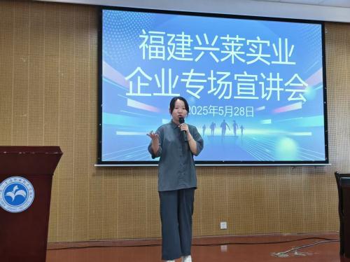 会议开始福建兴莱实业有限公司的代表黄依玲详细介绍了公司的发展历程、岗位需求、任职要求及未来发展方向等。通过一系列精彩演讲详细介绍了公司企业文化、人才培养、工作环境等方面内容,并为同学们展示了加入福建兴莱后的发展前景和福利待遇。
