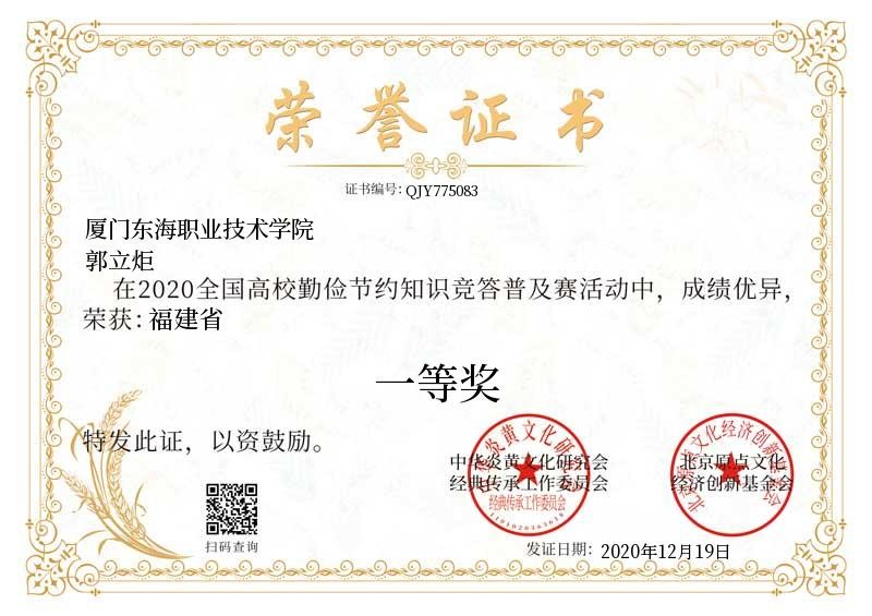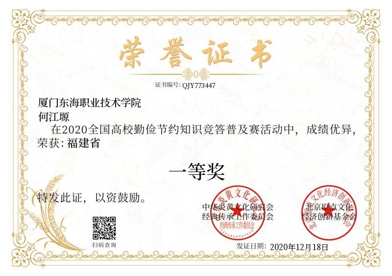 添加时间:2020-12-23为弘扬中华民族勤俭节约的优秀传统,让艰苦奋斗、勤俭节约的思想在人们心中扎根成为自觉意识。2020年11月30日,由中华炎黄文化研究会经典传承工作委员会、北京原点文化经济创新基金会主办,北京梭梭树文化传媒有限公司以及全国各高校党委、团委、学生会、社团组织联合协办的“勤俭·生活新·时尚勤俭节约”知识竞答中,我院学子软件技术二班的何江塬、鲁文杰、郭立炬、郑进棉在此次“知识竞答”中,均获得了福建省一等奖的优异成绩。